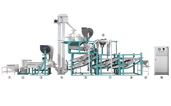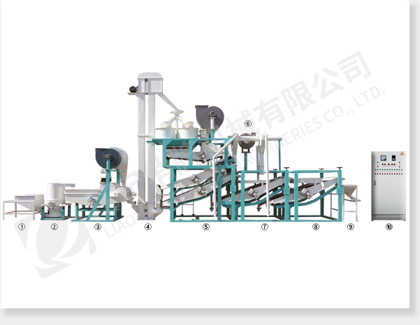 上料斗原料提升機 多功能除雜機 斗式提升機 脫殼、風選、分選主機 風力回料系統(tǒng) 籽仁復選機1 籽仁復選機2 接料斗 電氣控制柜